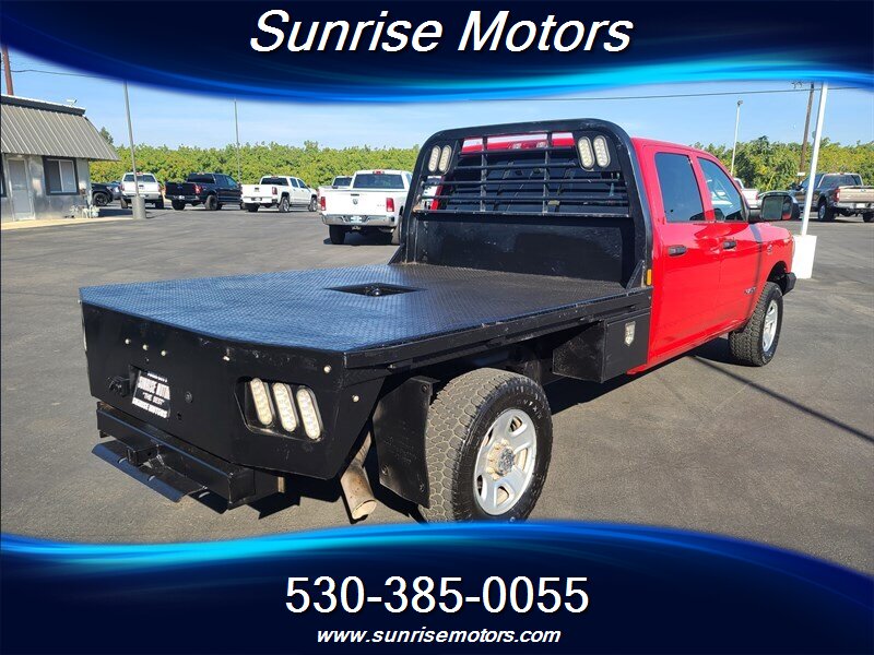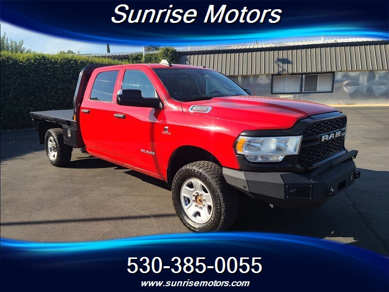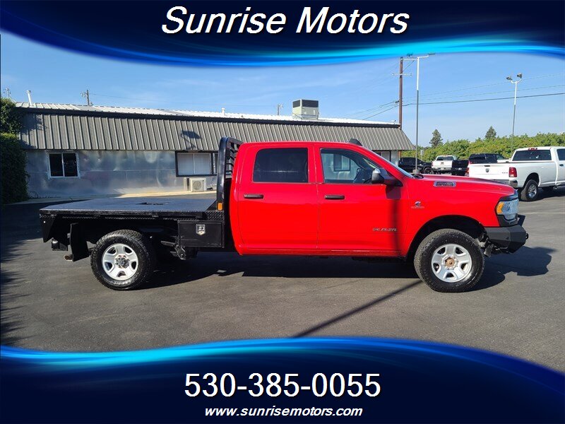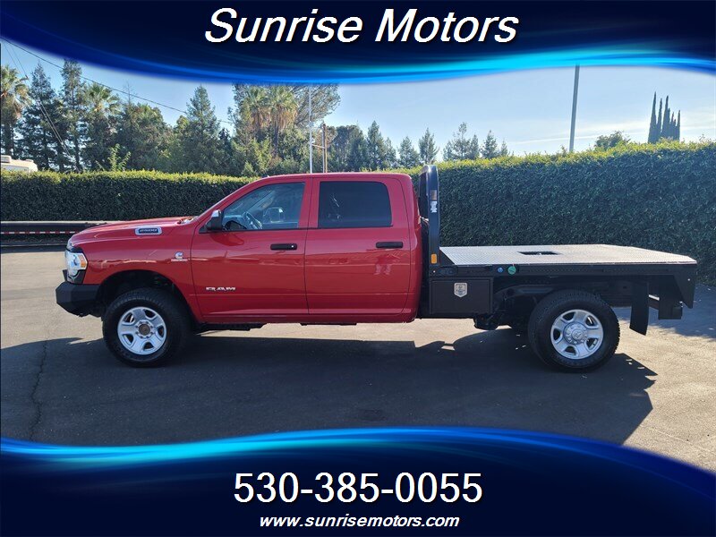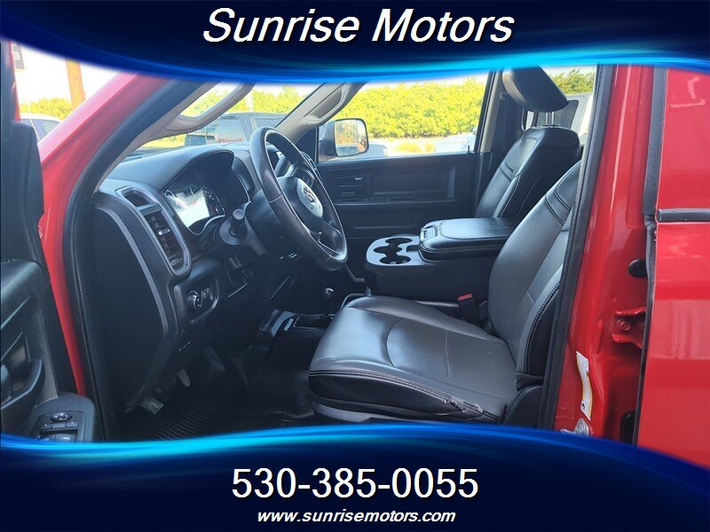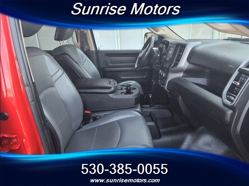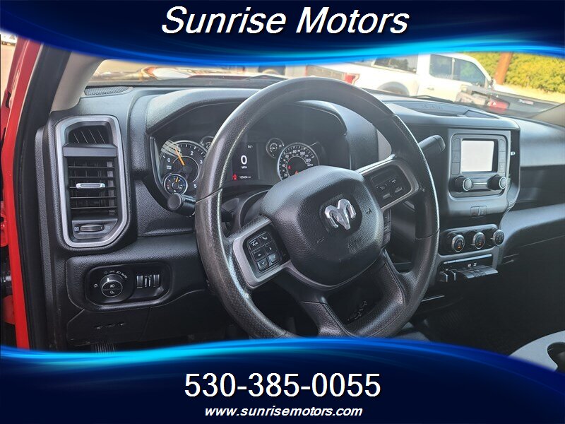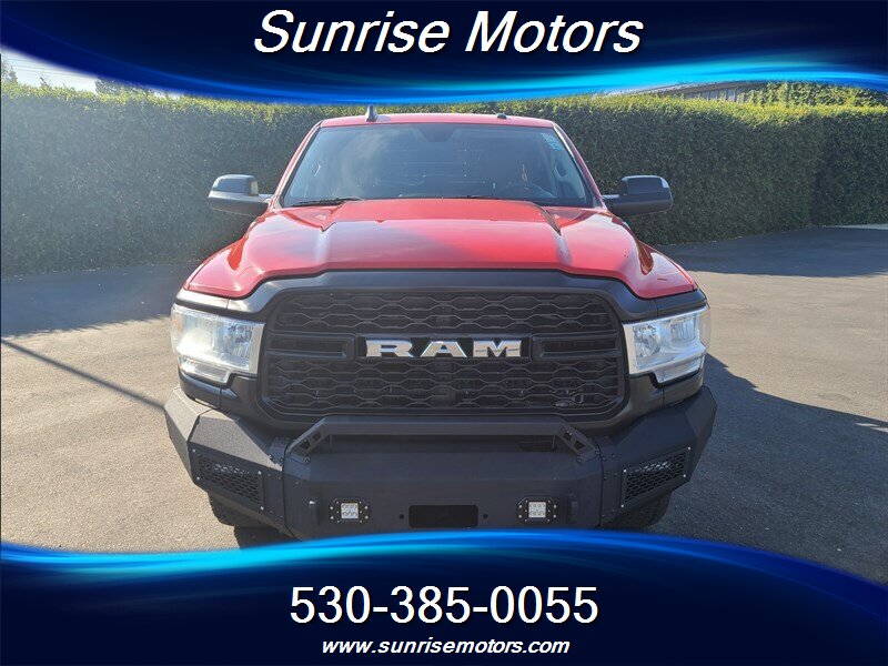 Let's talk about the factory default features of this bad boy. Starting with the exterior, this RAM 2500 Tradesman is painted in a striking Bright Red color that demands attention wherever it goes. The bold and rugged design of the truck is accentuated by its aggressive stance and muscular lines, showcasing its dominance on the road.